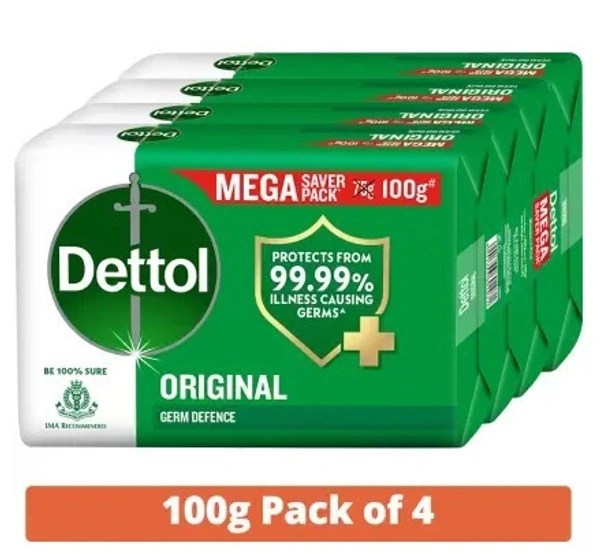 Be 100% sure to protect your skin from 100 illness-causing germs and bacteria. Dettol's Original Germ Protection Bathing Soap bar keeps your skin healthy every day. The trusted germ-protection formula of Dettol soap acts like a barrier between your skin and a wide range of unseen germs. The anti-bacterial properties of Dettol Original soap makes sure to provide a shield against unhealthy environment outside. It gives 100% better germ protection vs. ordinary soaps*. Dettol bathing soap keeps you fresh all-day long while the glycerine-rich formula gives a moisturised and healthy looking skin. Safety Information: Keep out of reach of children unless under adult supervision. Avoid direct contact with eyes. For external use. In case of contact with eyes, rinse immediately with plenty of water. If persistent irritation occurs, seek medical attention.