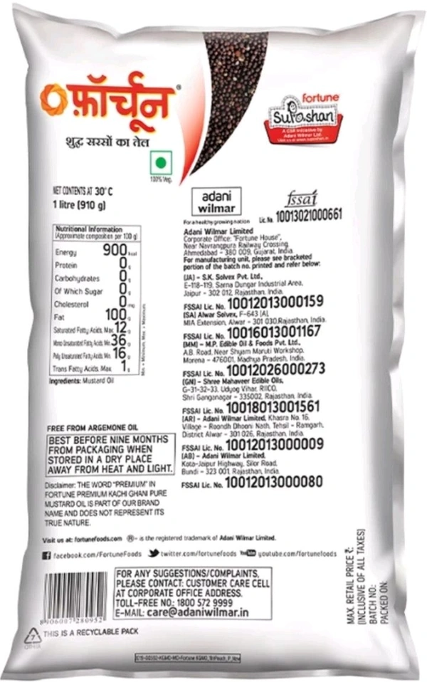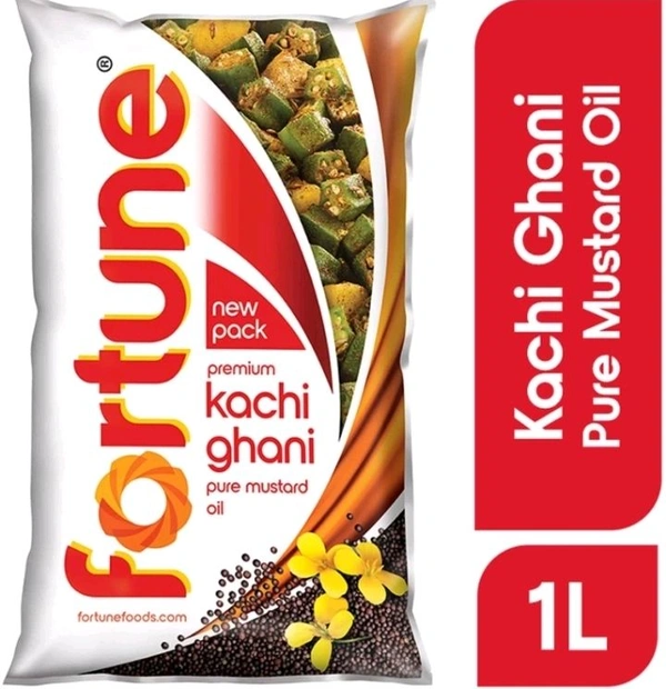 FORTUNE Premium kachi ghani pure Mustard Oil Pouch (Sarson Tel) 1L