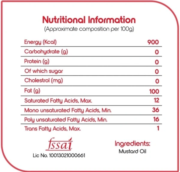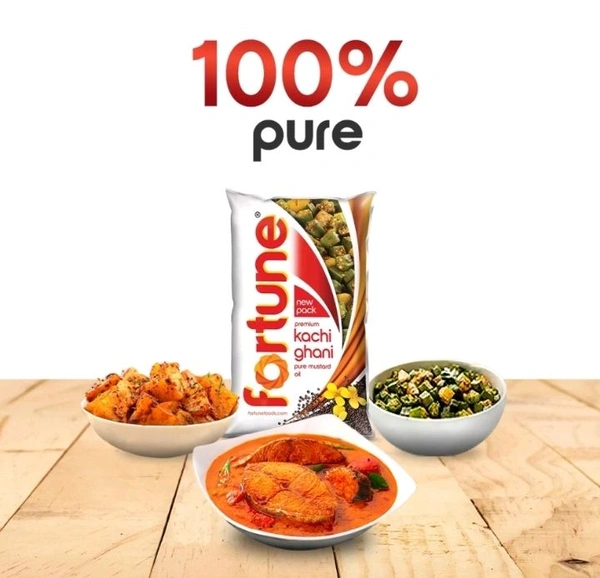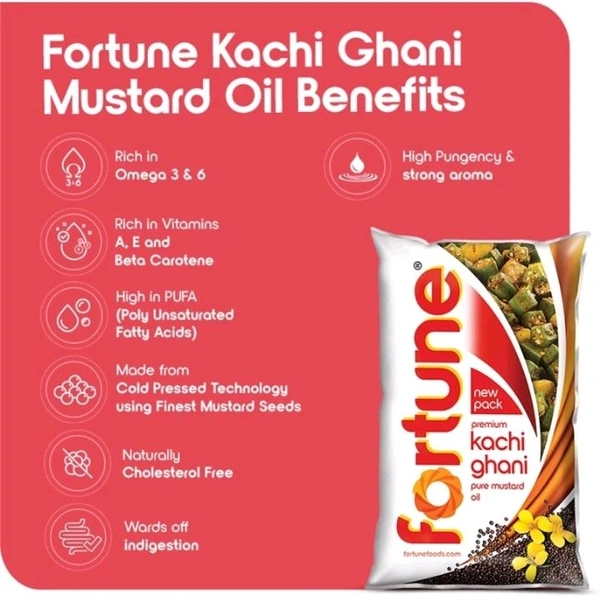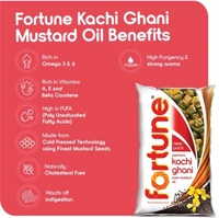 Fortune Premium Kachi Ghani Pure Mustard Oil, traditionally extracted from the first press of mustard seeds, comes with a high pungency level and strong aroma. Being pure, our cooking oil retains its natural properties and mustard oil benefits. Its strong aroma and pungency will spice up your cooking. Made from Cold Pressed (Kachi Ghani) Technology using Finest Mustard Seeds - Rich in Omega 3 & 6 that boost Immunity. Rich in Vitamins A,E and Beta Carotene. Naturally Cholesterol Free. High in PUFA (Poly Unsaturated Fatty Acids). High Pungency and Strong Aroma - Mustard Oil with Long Shelf Life.