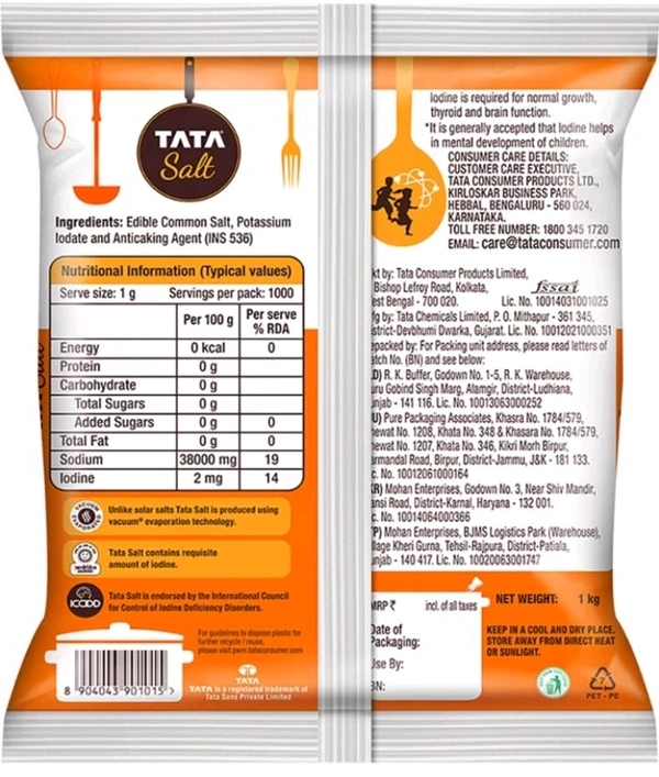 Desh ki Sehat, Desh ka Namak! Now celebrating 40 years of trust, Tata Salt has pioneered India largest vacuum evaporation technology. Untouched by hand, Tata Salt offers an assurance of Iodine. With vacuum evaporation technology, Tata namak offers a hygienic alternative to your regular table salt. It contains the requisite amount of iodine which is an essential dietary nutrient for humans. Iodine is required for normal growth, thyroid, and brain function. Add the goodness of Tata Salt to your dietary intake and make your meals delicious and nourishing. Storage Instructions: Store in a cool and dry place. *It is generally accepted that Iodine helps in the mental development of children.